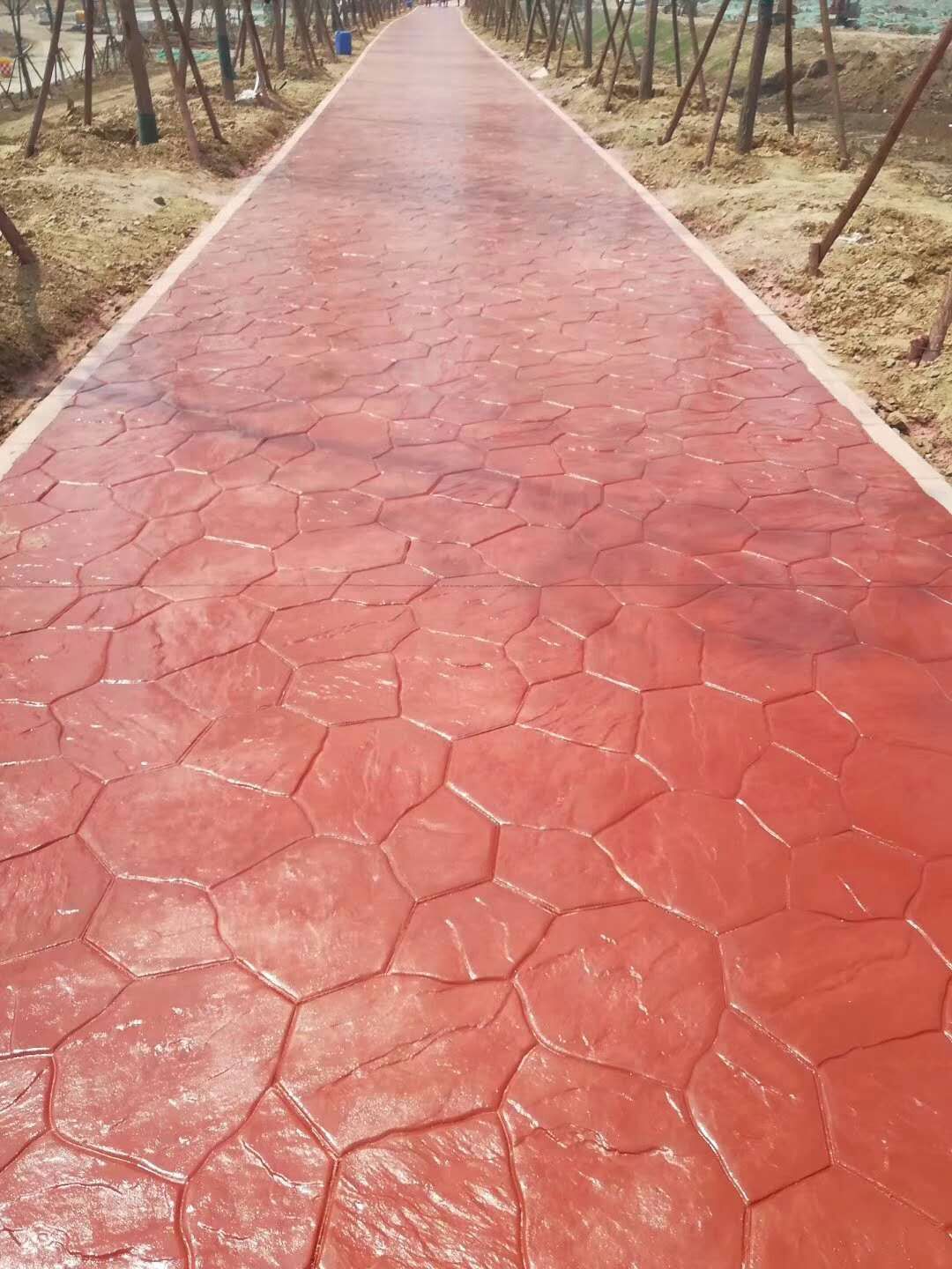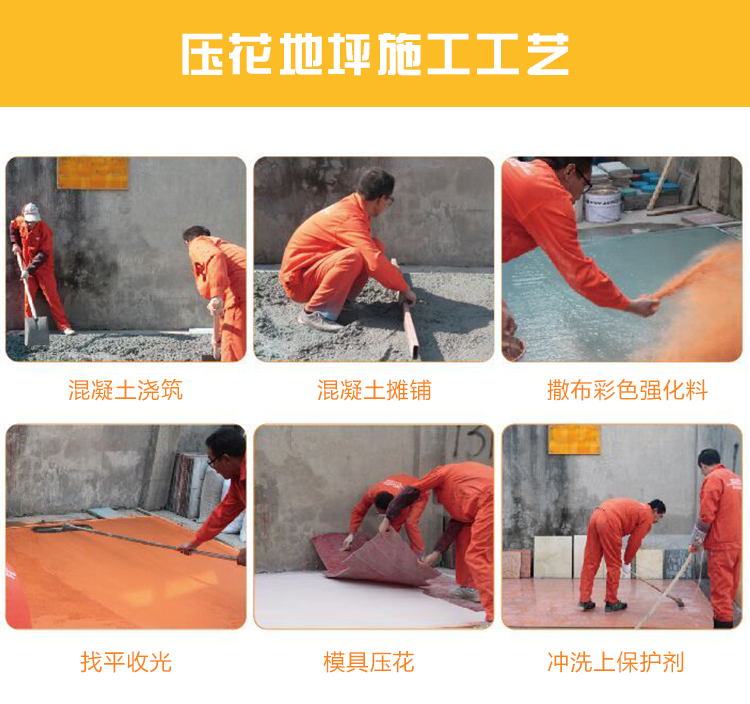 4.彩色脫模粉處理:施工的表面均勻拋撒彩色脫模粉,將整個表面覆蓋,同時在模具的表面也上一些脫模粉;